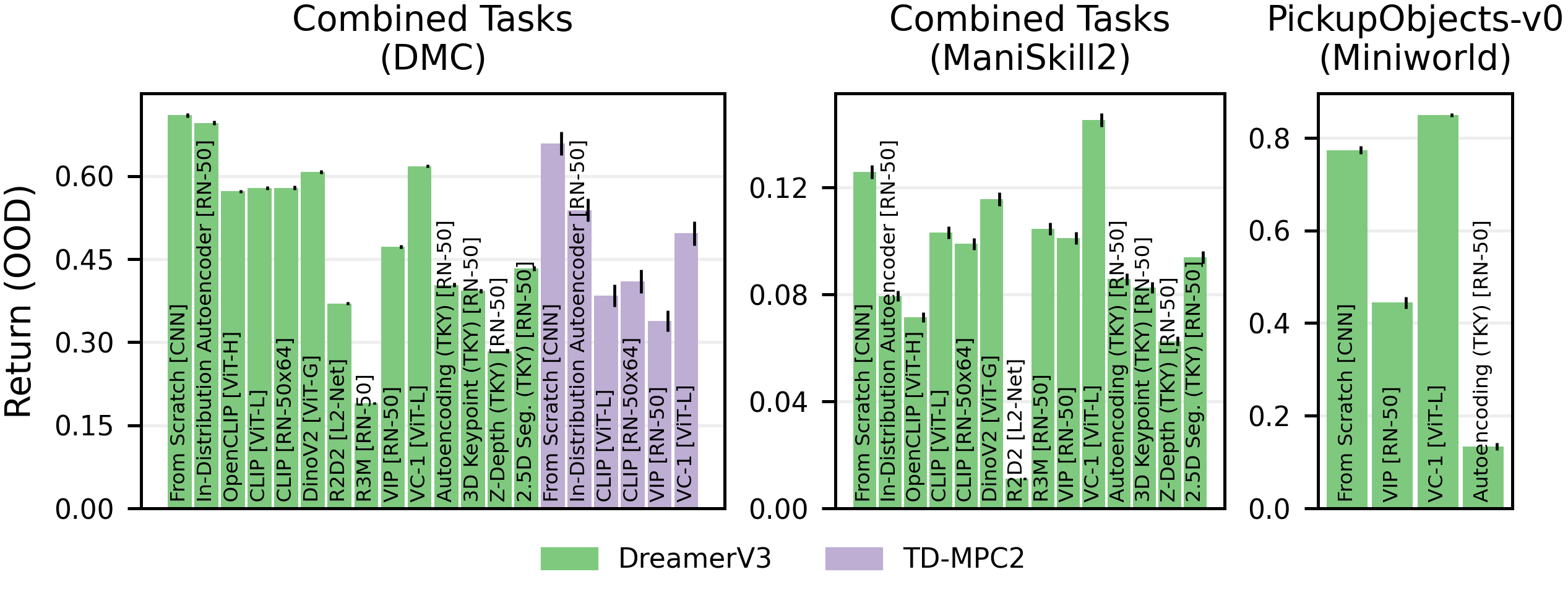 Average performance on DMC, ManiSkill2 and Miniworld tasks in the OOD setting.